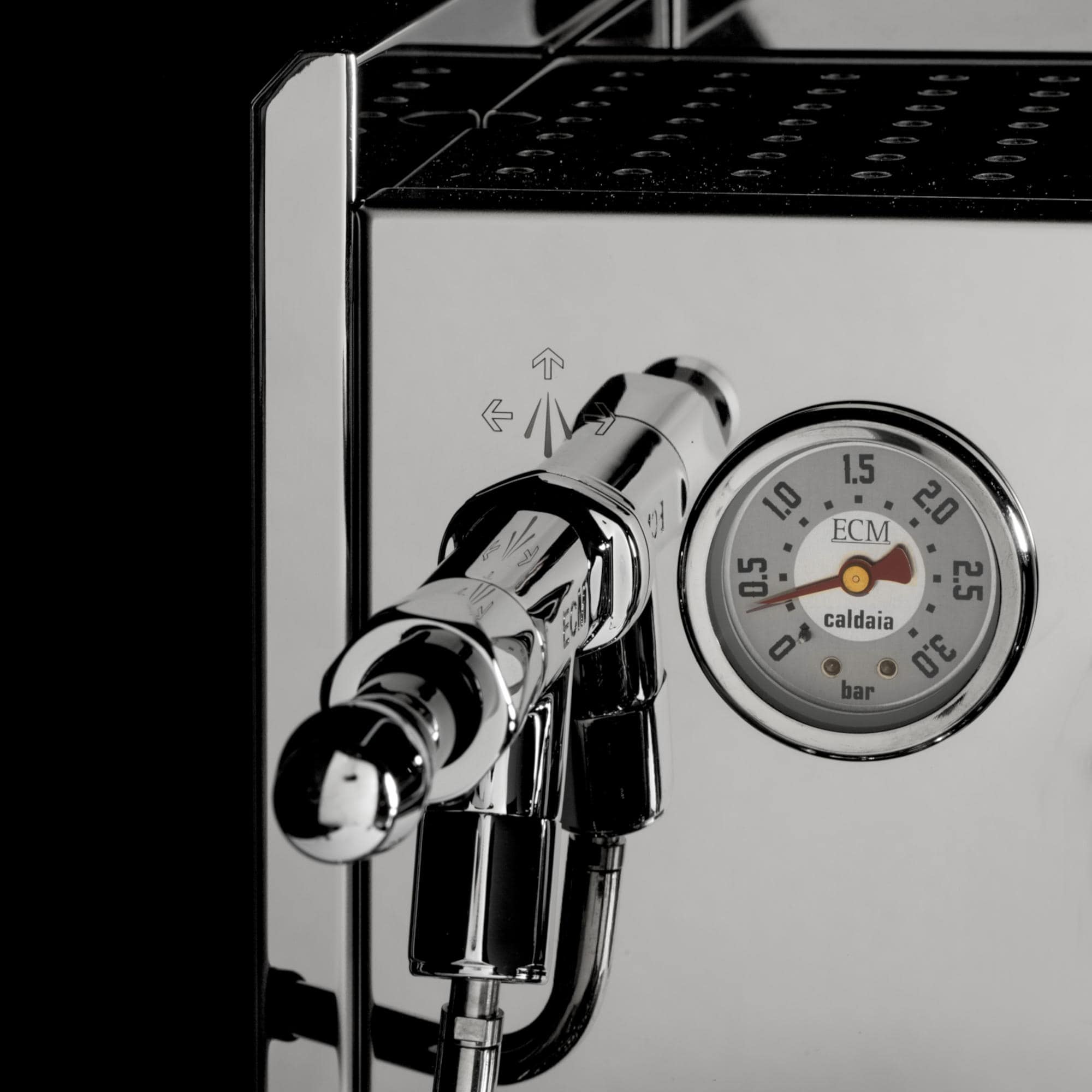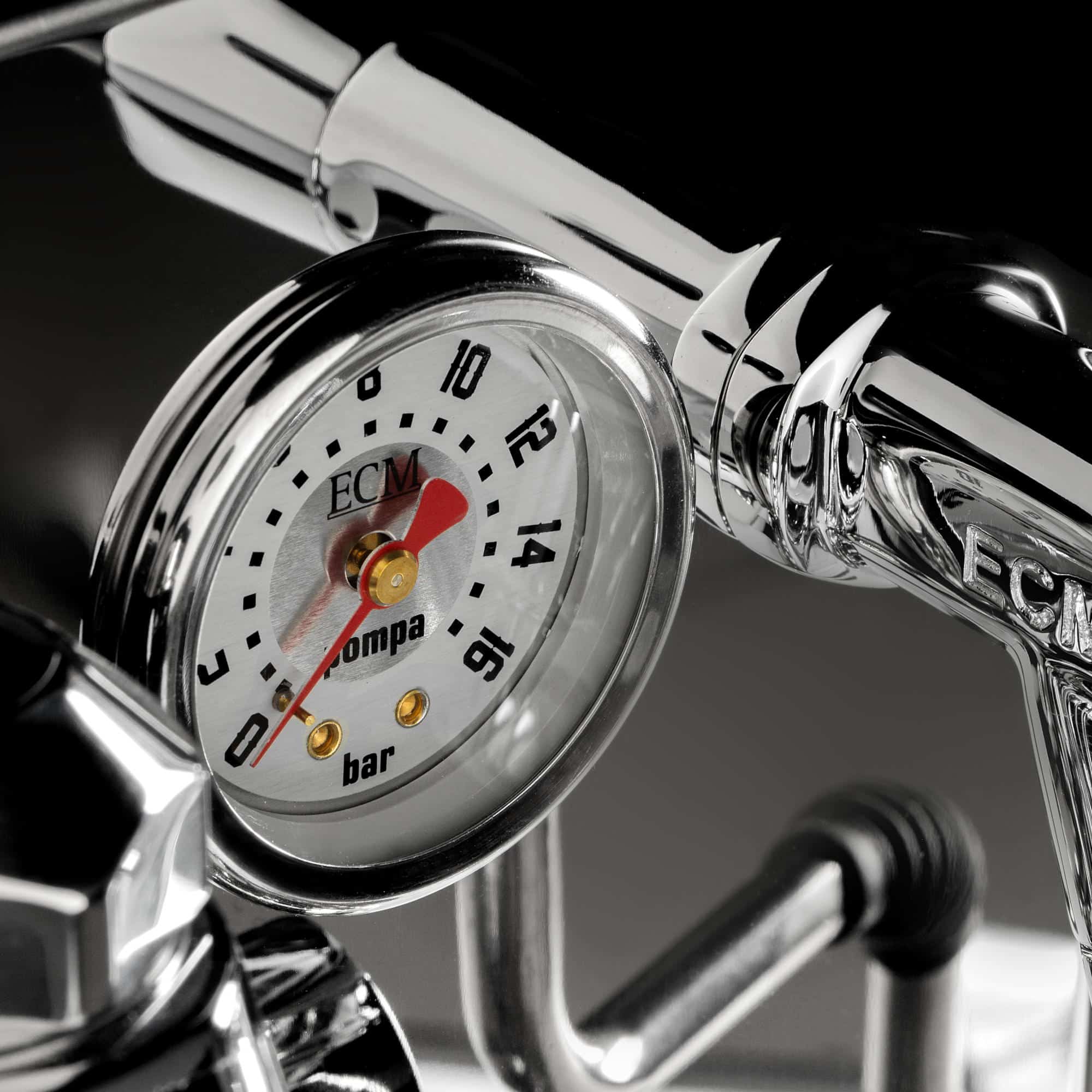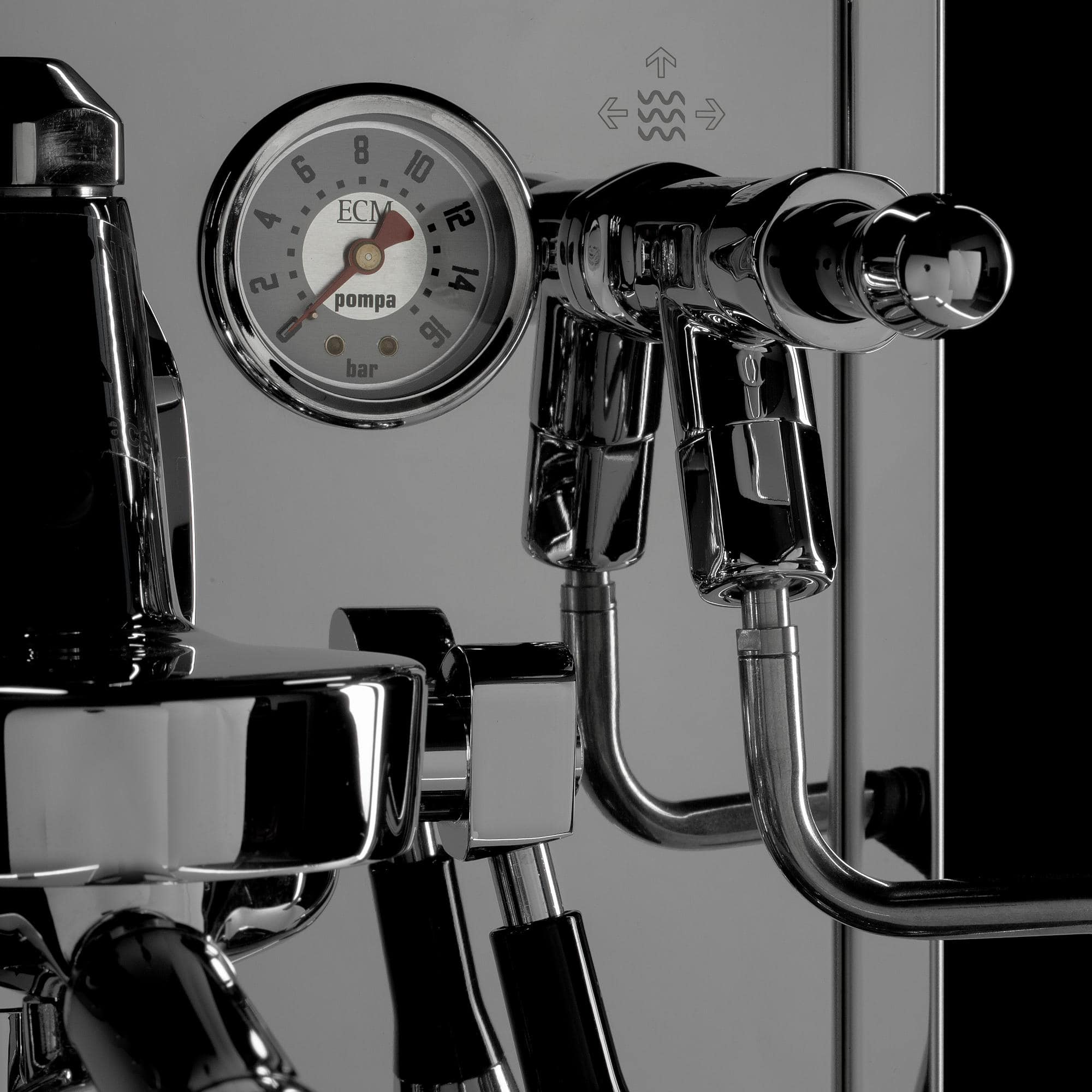 Mit der ECM Synchronika II Exclusive Line holen Sie sich nicht nur eine Espressomaschine, sondern ein echtes Design-Highlight in Ihre Küche oder Ihr Büro. Das Gehäuse aus poliertem Edelstahl mit anthrazitfarbener Pulverbeschichtung wirkt edel und modern zugleich. Große Manometer im Retrolook geben Ihnen jederzeit präzise Auskunft über Kessel- und Pumpendruck. Die Rotationspumpe arbeitet besonders leise und ermöglicht den wahlweisen Betrieb mit Wassertank oder Festwasseranschluss. Zwei ergonomisch abgewinkelte Filterträger mit perfekter Gewichtsverteilung runden die hochwertige Verarbeitung ab.