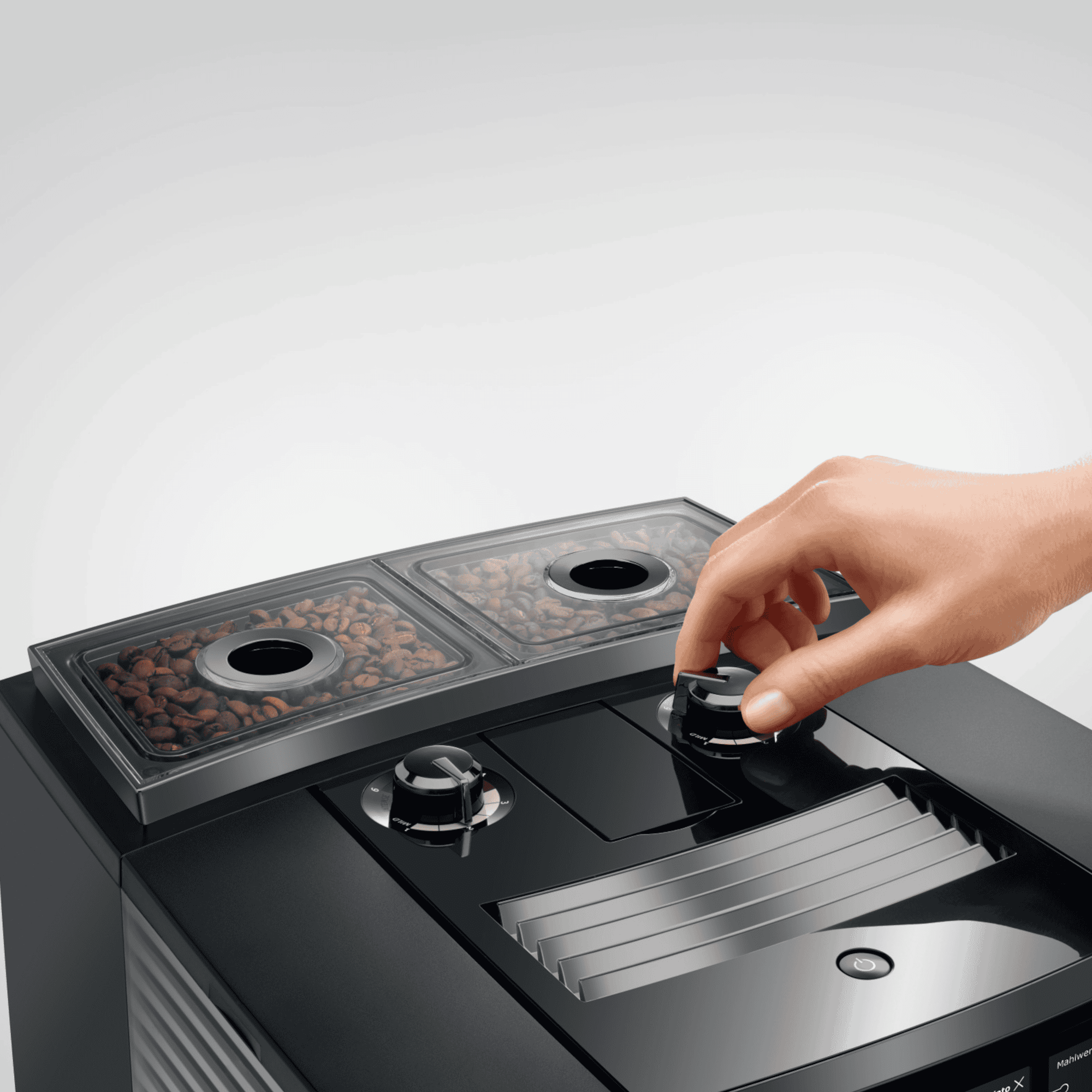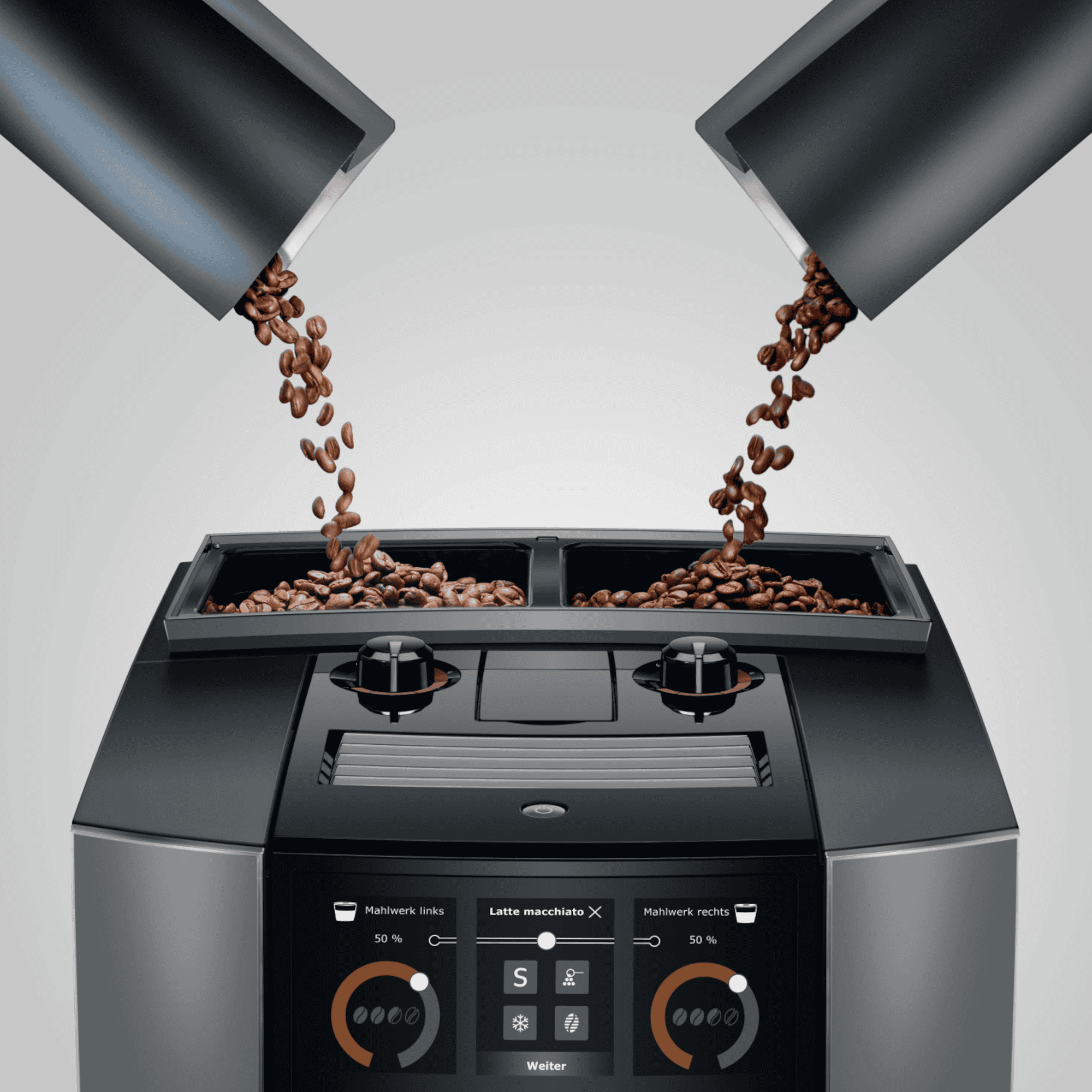 Im Gegensatz zu klassischen JURA Kaffeevollautomaten wie einer JURA E6 oder JURA E8 eröffnet dir die J10 twin deutlich mehr Flexibilität. Jede Bohne wird im eigenen Mahlwerk verarbeitet, aktiv überwacht und präzise gemahlen. So entsteht gleichbleibend hohe Qualität, unabhängig davon, welche Kaffeesorte du wählst.